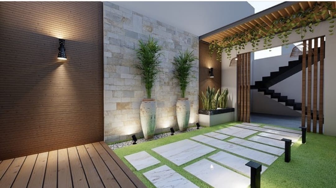 ديكورات حجريه وتصميمات بأشجار صناعيه أسفل الدرج مما يعطي مظهر رائع لمنزلك نختار الأشجار الصناعية بألوان رائعة .